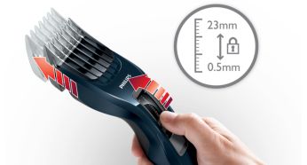 Prilagodljivi češalj ima 12 postavki duljine, od 1 do 23 mm, u preciznim koracima od 2 mm, omogućavajući jednostavan odabir i zaključavanje željene postavke duljine. Aparat možete koristiti i bez češlja za podrezivanje na kratkih 0,5 mm.